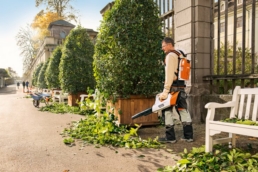 De bladblazers van Stihl laten niet alleen bij openbare plaatsen een schone indruk achter. Ook waar grote percelen moeten worden bevrijd van blad of gemaaid gras leveren zij grootse prestaties. Evenals de Stihl zuighakselaars die gras en bladeren opzuigen en het materiaal fijn hakselen.